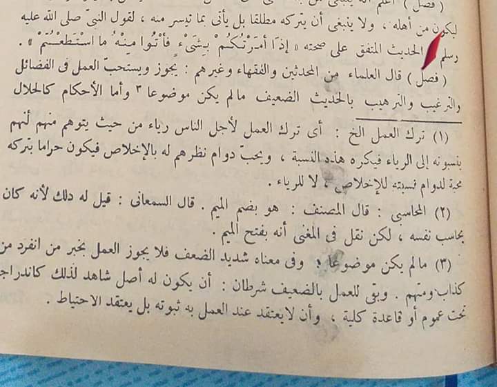 (فصل) قال العلماء من المحدثين والفقهاء وغيرهم : يجوز ويستحّب العمل في الفضائل والترغيب والترهيب بالحديث الضعيف ما لم يكن موضوعا وأما الأحكام كالحلال والحرام والبيع والنكاح والطلاق وغير ذلك فلا يعمل فيها إلا بالحديث الصحيح أو الحسن إلا أن يكون في احتياط في شىء من ذلك، كما إذا ورد حديث ضعيف بكراهة بعض البيوع أو الأنكحة، فإن المستحبّ أن يتنزه عنه ولكن لا يجب. وإنما ذكرت هذا الفصل لأنه يجىء في هذا الكتاب أحاديث أنصّ على صحتها أو حسنها أو ضعفها، أو أسكت عنها لذُهول عن ذلك أو غيره، فأردت أن تتقرّر هذه القاعدة عند مُطالع هذا الكتاب.